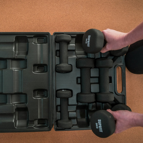 JETZT NEU! Das Suprfit Gymnastikhantel Set 1-3 kg inkl. Koffer ist die ideale Lösung für ein effektives Heimtraining. Dieses Set umfasst drei Hanteln mit unterschiedlichen Gewichten und einen praktischen Koffer, der für Ordnung und Übersicht sorgt.
